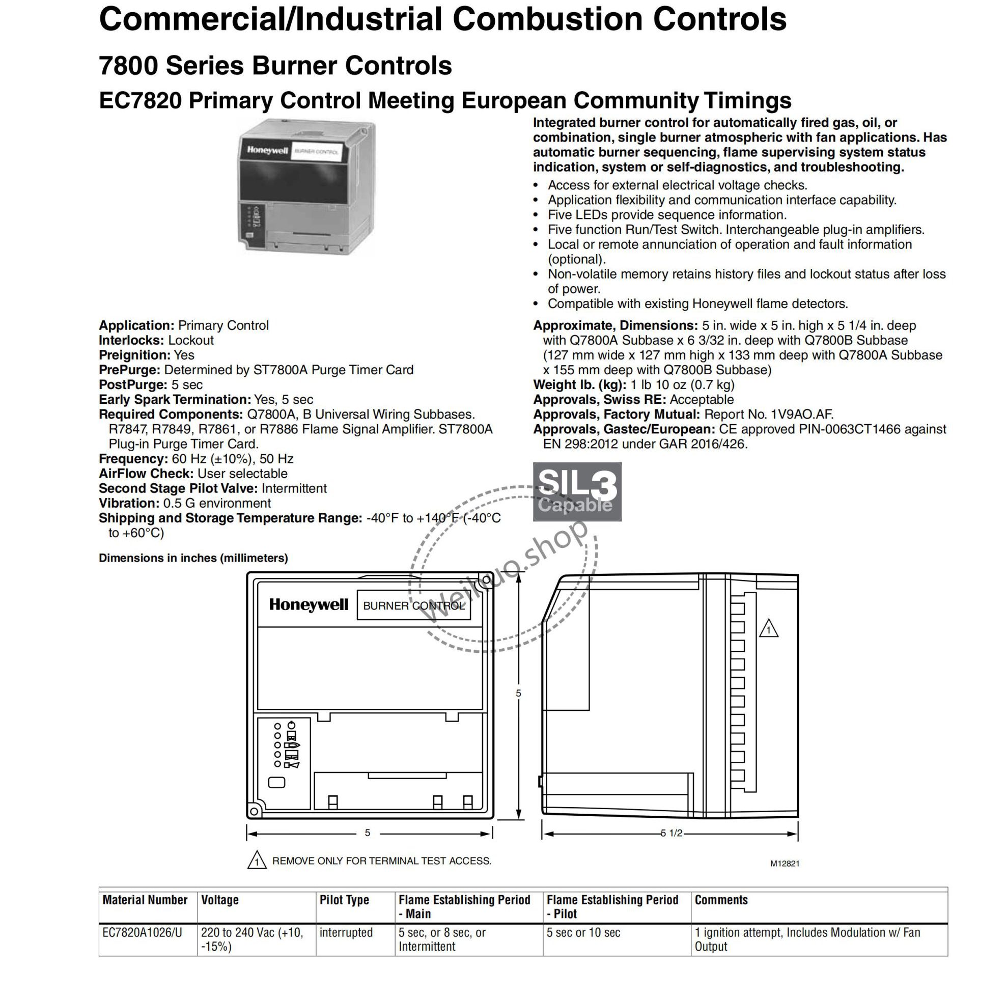 Integrated burner control for automatically fired gas, oil, or combination, single burner atmospheric with fan applications. Has automatic burner sequencing, flame supervising system status indication, system or self-diagnostics, and troubleshooting.