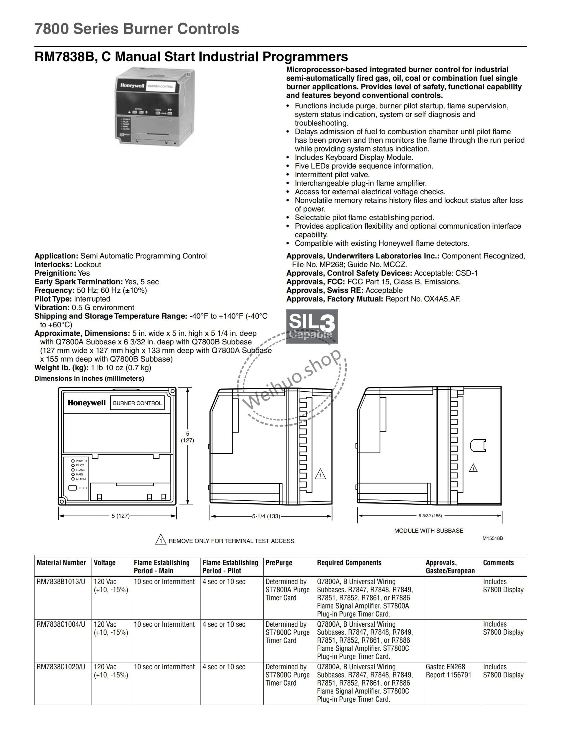 Honeywell 7800 Series Burner Controls- RM7838B1013/U Manual Start Industrial Programmers
