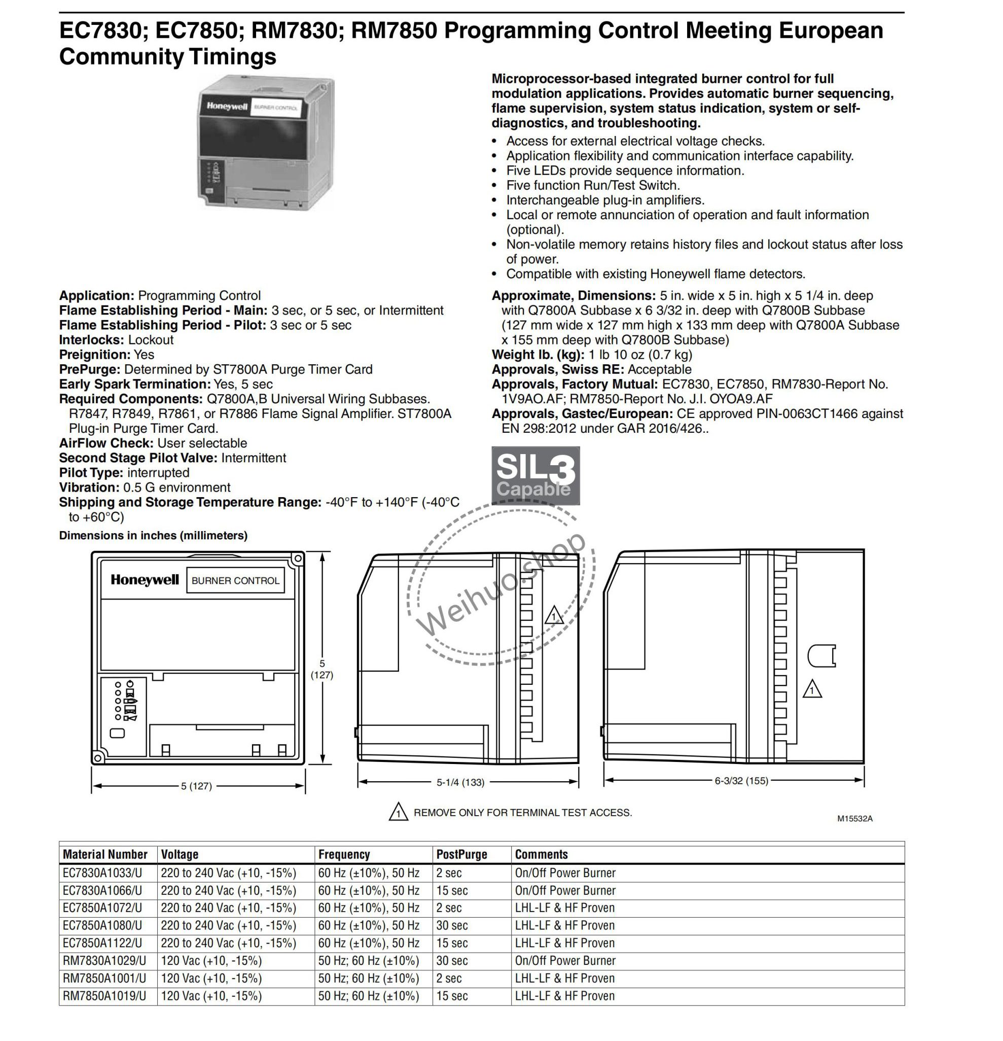 The Honeywell EC7850 is a microprocessor-based burner control designed for automatic sequencing and safety monitoring of single atmospheric or fan-assisted burners on industrial and commercial heating systems.