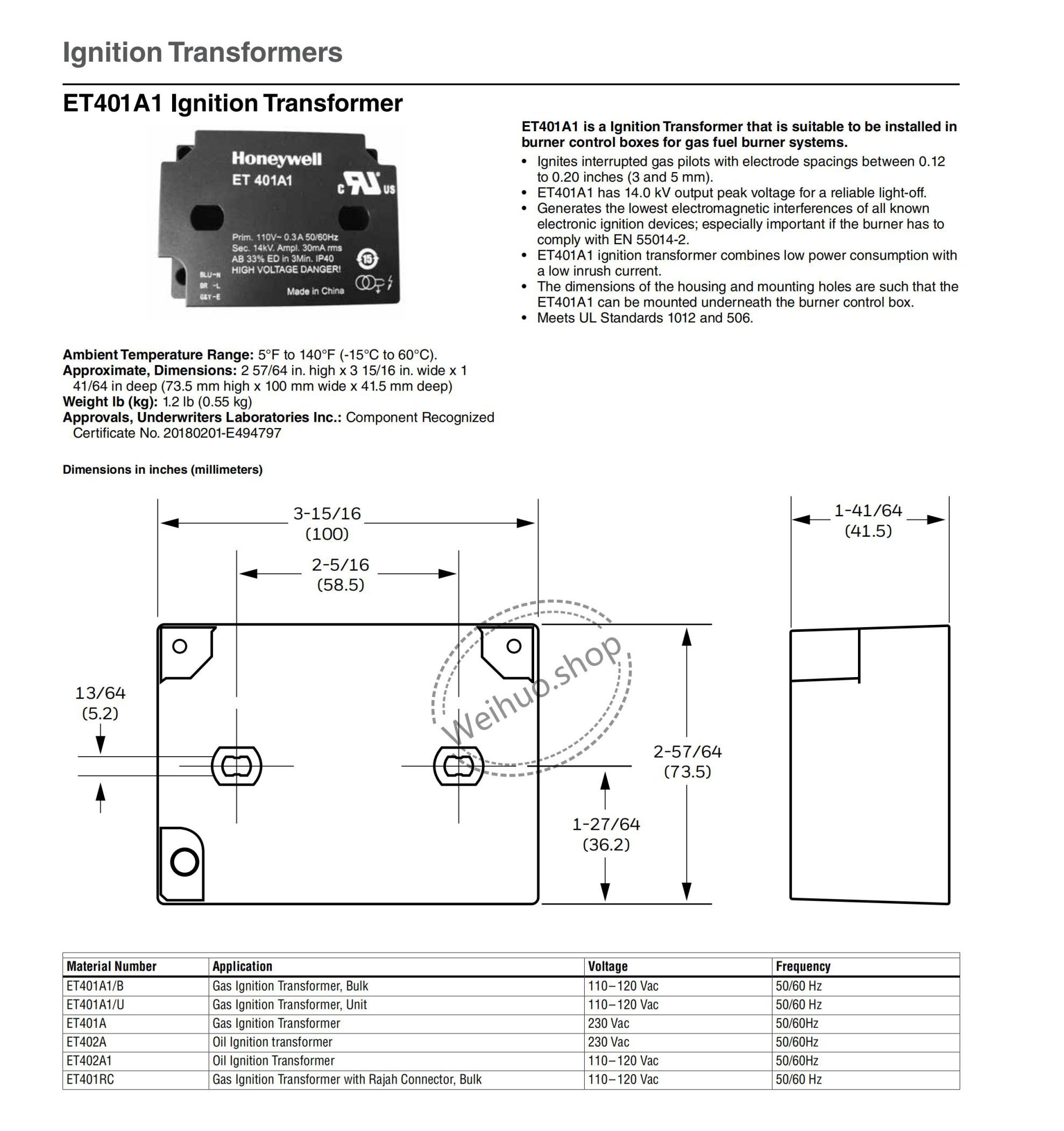 ET401A1 is a Ignition Transformer that is suitable to be installed in