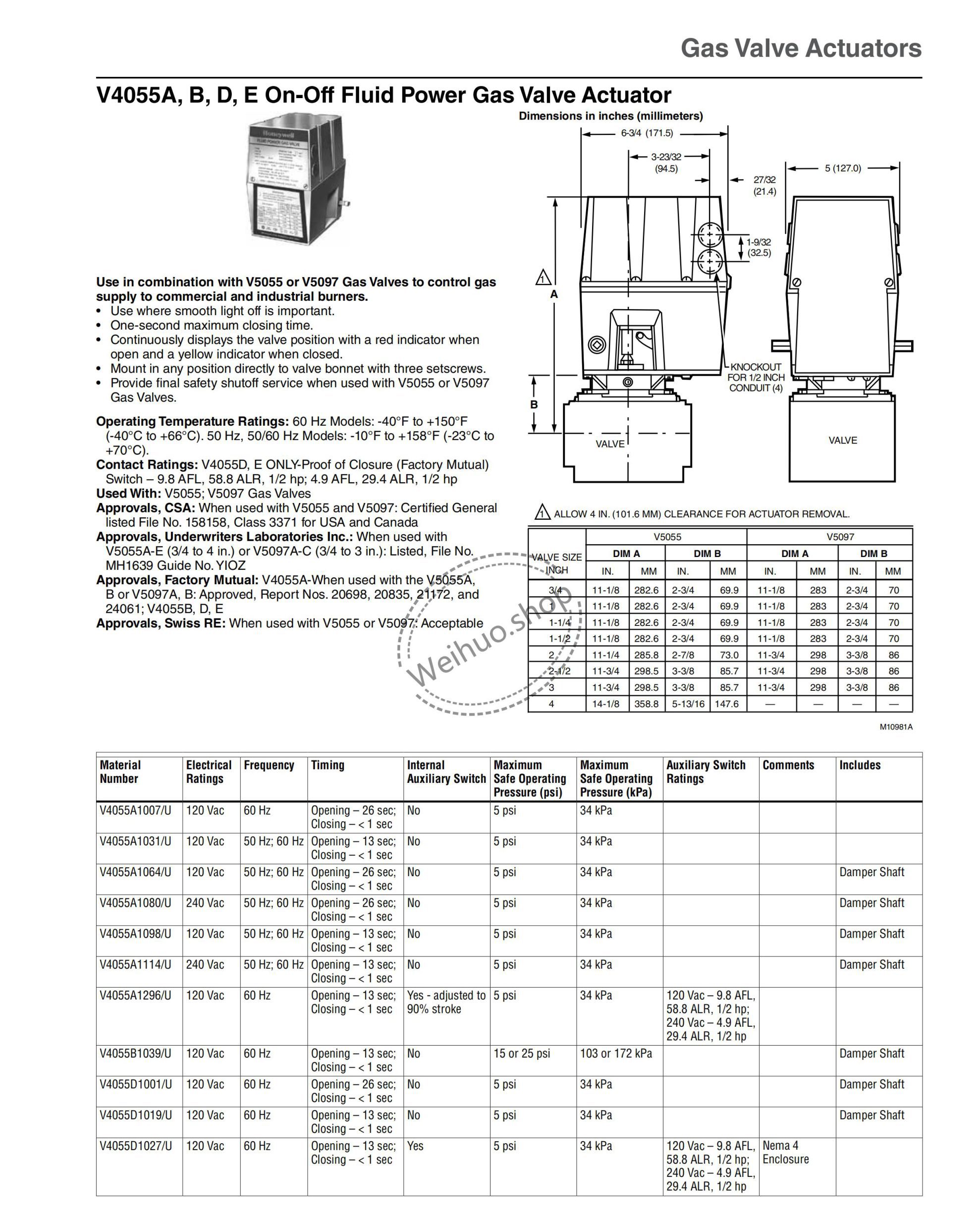 V4055A, B, D, E On-Off Fluid Power Gas Valve Actuators
