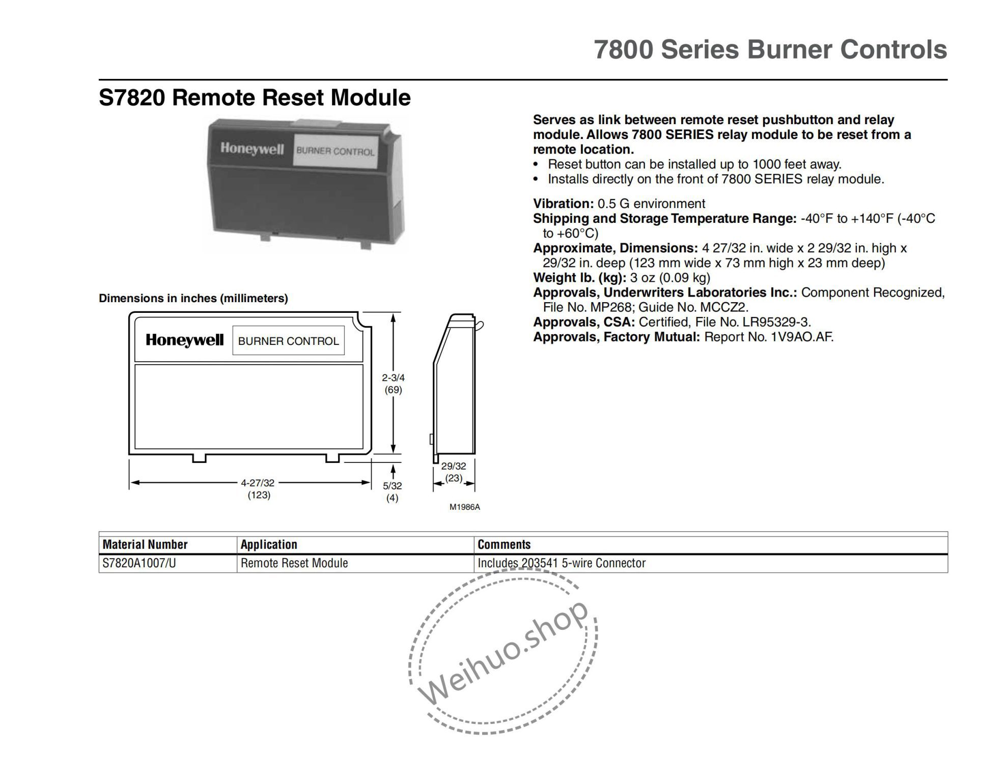 S7820 Remote Reset Module 7800 Series Burner Controls